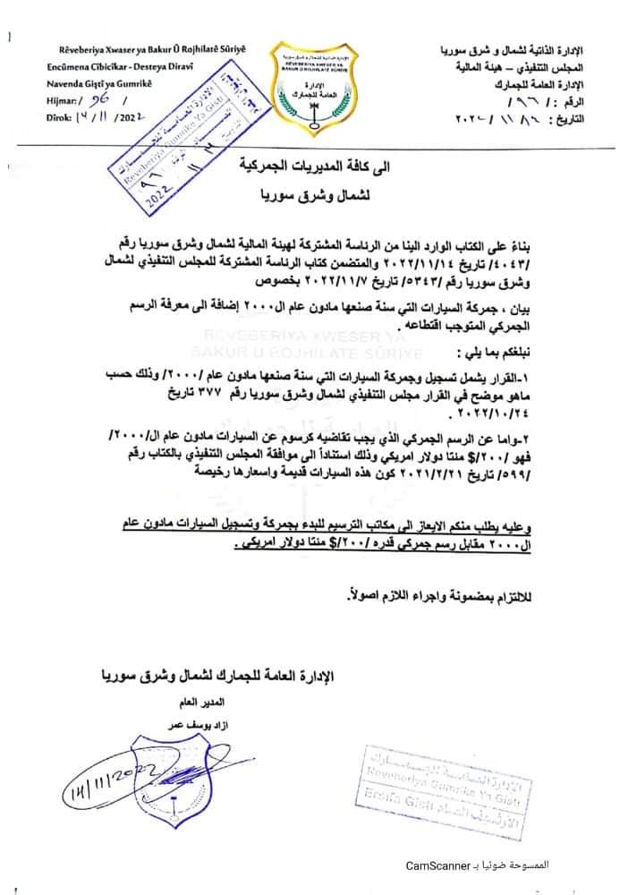أصدرت الإدارة العامة للجمارك في شمال وشرق سوريا، أمس الاثنين، تعميماً يقضي بتسجيل وجمركة المركبات التي سنة صنعها مادون 2000 حسب ما هو موضح في قرار المجلس التنفيذي الصادر بتاريخ الرابع والعشرين من أكتوبر / تشرين الأول الفائت.