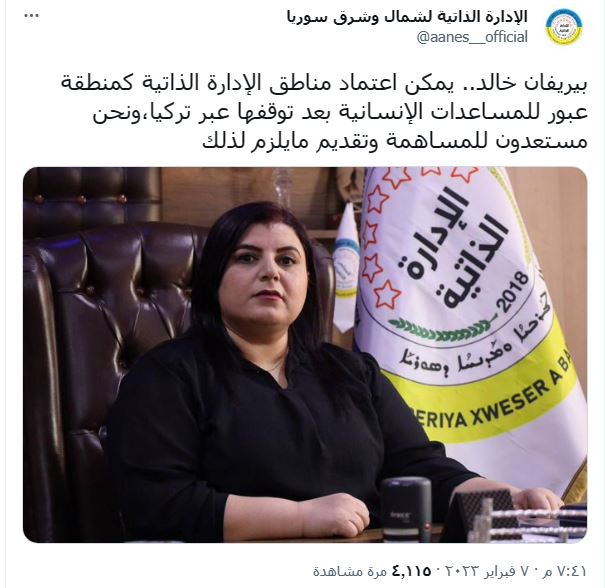 وجاء ذلك في تغريدة للرئيسة المشتركة للمجلس التنفيذي في الإدارة الذاتية “بيريفان خالد” ، على تويتر وقالت فيها: “يمكن اعتماد مناطق الإدارة الذاتية كمنطقة عبور للمساعدات الإنسانية بعد توقفها عبر تركيا، ونحن مستعدون للمساهمة وتقديم ما يلزم لذلك”.