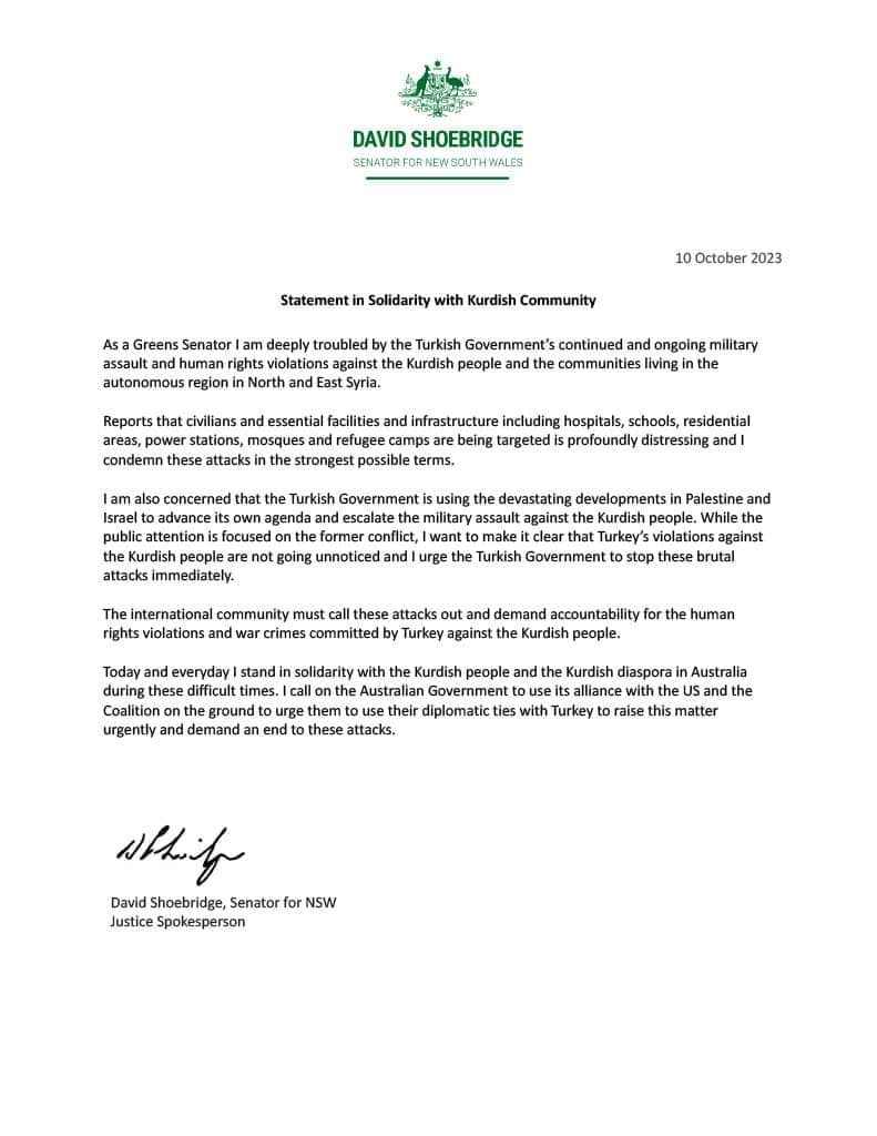 أدان العضو في مجلس الشيوخ والسيناتور الأسترالي “ديفيد شوبريدج” هجمات الاحتلال التركي ضد مناطق الإدارة الذاتية لشمال وشرق سوريا والتي تستهدف المدنيين والمرافق الأساسية والبنية التحتية.