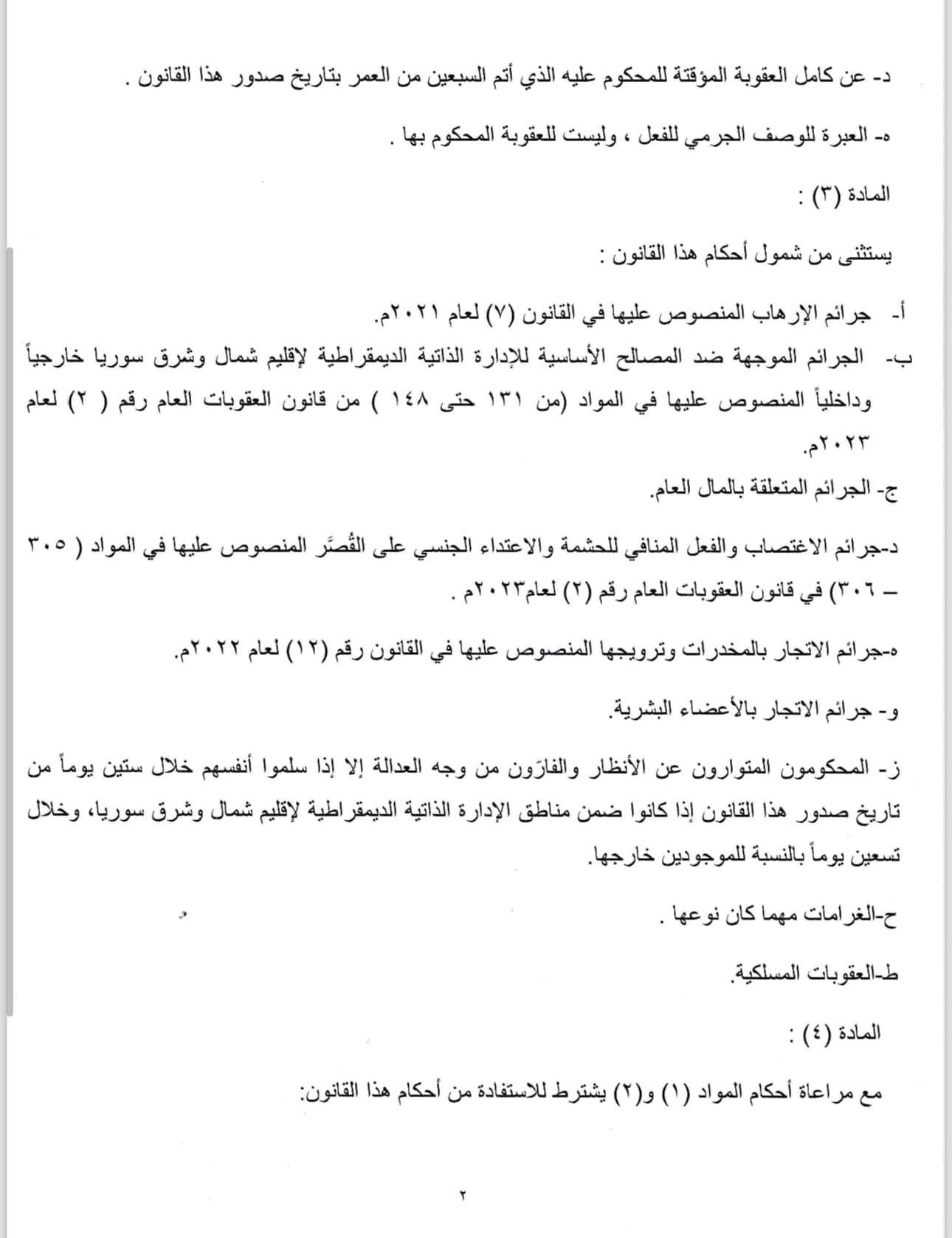 كما استثنى القانون المحكومون المتوارون عن الأنظار والفارون من وجه العدالة إلا إذا سلموا أنفسهم خلال ستين يوماً من تاريخ صدور هذا القانون إذا كانوا ضمن مناطق الإدارة الذاتية لشمال وشرق سوريا وخلال تسعين يوماً إن كانوا خارج المنطقة.