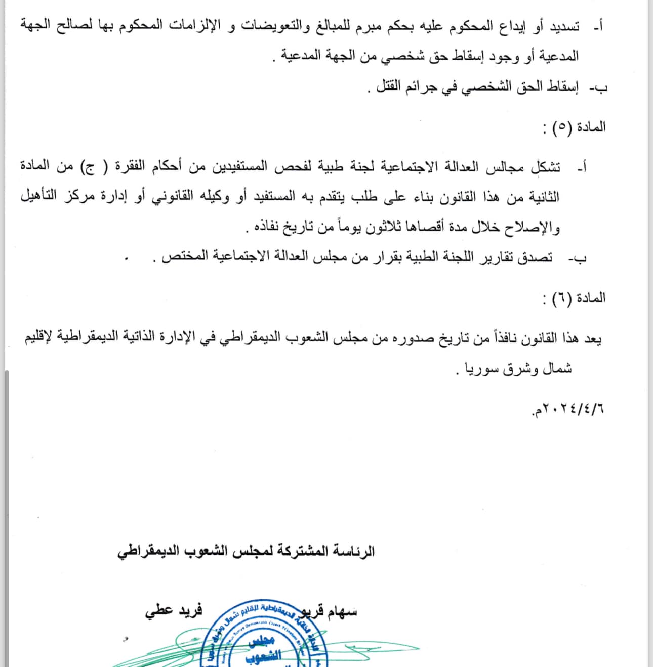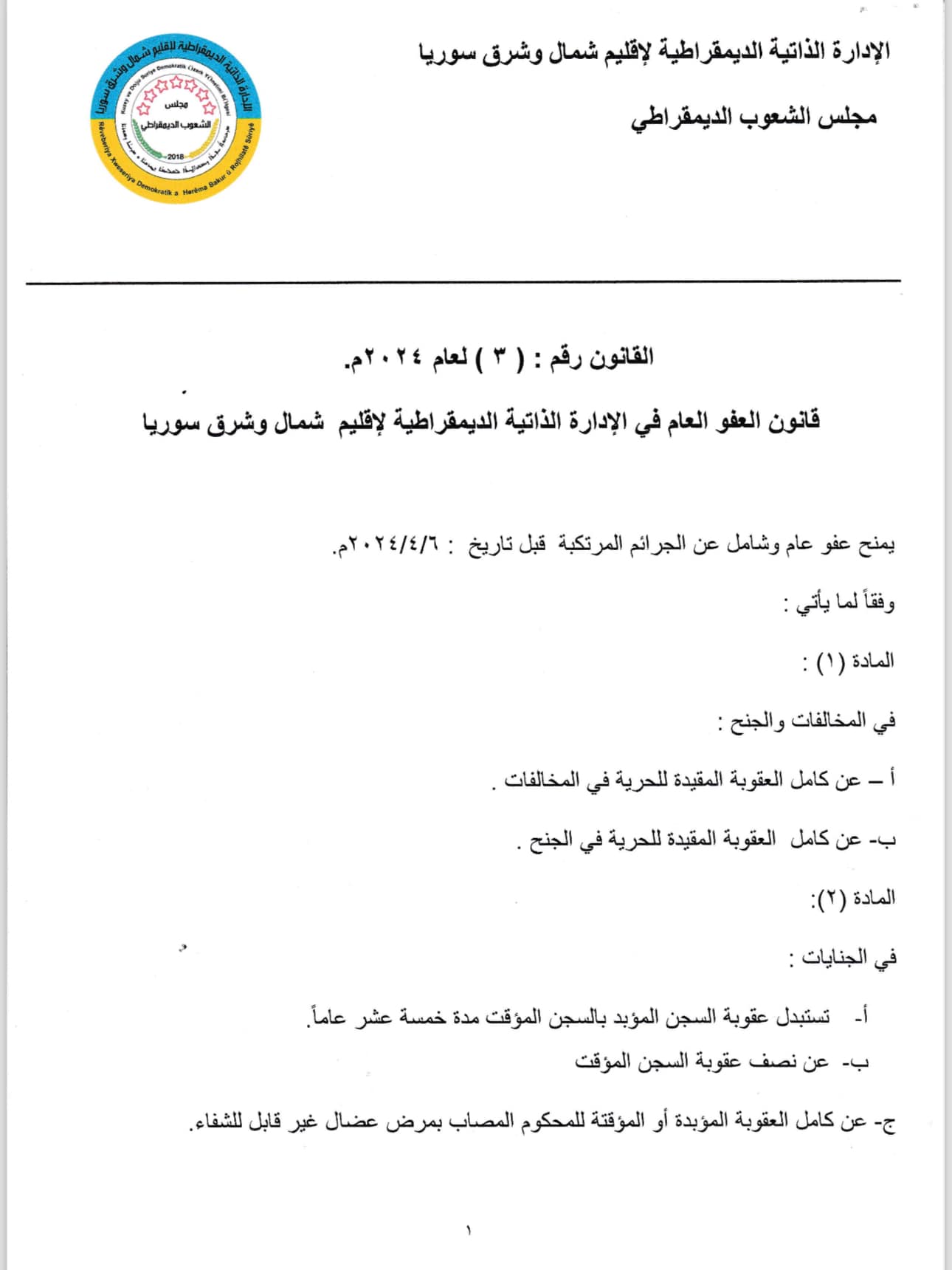 أصدر المجلس العام في الإدارة الذاتية لإقليم شمال وشرق سوريا اليوم السبت، عفواً عاماً عن كافة الجرائم المُرتكبة قبل تاريخ 6 / 4 / 2024، وذلك بمناسبة اقتراب عيد الفطر.
