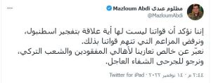 أكد القائد العام لقوات سوريا الديمقراطية “مظلوم عبدي” في تغريدة له على تويتر أنه ليس لقوات قسد أي علاقة بتفجير اسطنبول، الذي حدث يوم أمس.