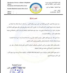 كما تقدم المجلس المدني بالشكر لمجلس دير الزور العسكري والمجالس العسكرية الأخرى التي شاركت بعملية “تعزيز الأمن”، وعبرّ عن امتنانه للعشائر التي ساهمت في إفشال المخططات.