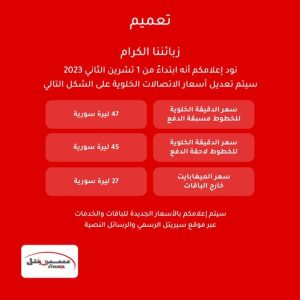 وبحسب قائمة الأسعار الجديدة، سيصبح سعر الدقيقة الخلوية 47 ل.س للخطوط مسبقة الدفع، و45ل.س بالنسبة للخطوط لاحقة الدفع، بينما سيصبح سعر الميغا بايت خارج الباقات 17 ل. س، وذلك اعتباراً من بداية نوفمبر (تشرين الثاني) المقبل.
