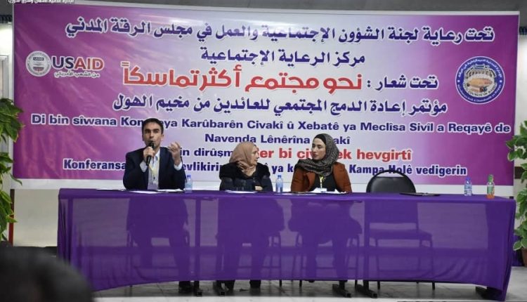 نظمت لجنة الشؤون الاجتماعية والعمل في الإدارة المدنية الديمقراطية للرقة، اليوم الثلاثاء، مؤتمر إعادة الدمج المجتمعي للعائدين من مخيم الهول تحت شعار “نحو مجتمع أكثر تماسكاً”، وذلك بهدف إعادة دمج العوائل العائدة من المخيم في المجتمع بشكل سليم.