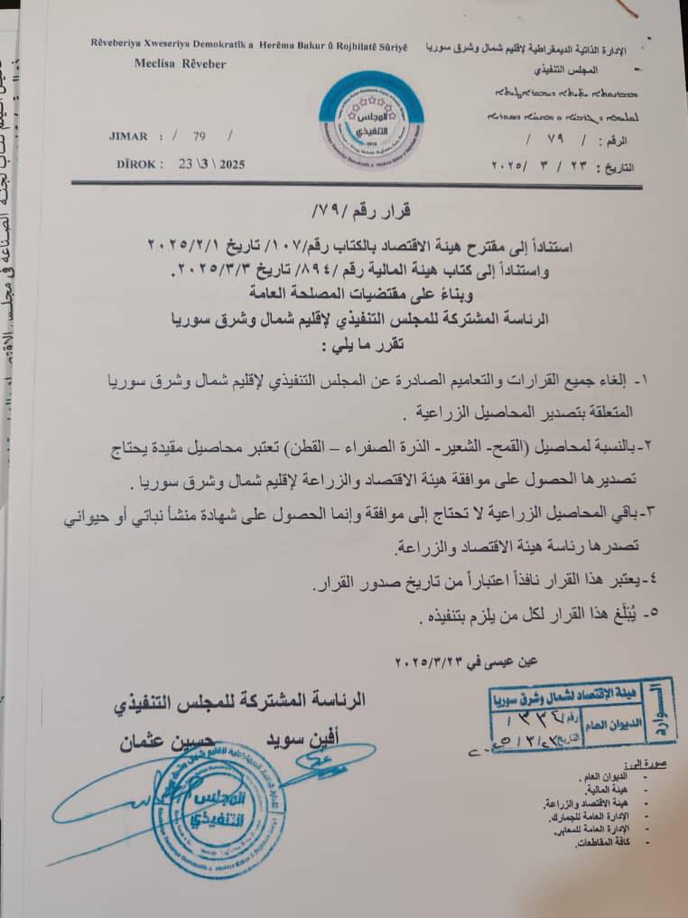 أصدر المجلس التنفيذي في الإدارة الذاتية لشمال وشرق سوريا، اليوم الأحد، قراراً يقضي بإلغاء جميع القرارات والتعاميم السابقة المتعلقة بتصدير المحاصيل الزراعية، مضيفا بأن “القمح والشعير والذرة الصفراء والقطن” تعتبر محاصيل مقيدة يحتاج تصديرها الحصول على موافقة هيئة الاقتصاد والزراعة.