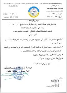 وبحسب نص القرار رقم /257/، فإن عملية التصدير ستخضع لإجراءات قانونية وإدارية محددة، من بينها اعتماد نموذج مهم صادر عن لجنة السوق المجتمعي المرفق بالقرار، والذي سيُستخدم في المعابر لاستكمال معاملات التصدير الرسمية.