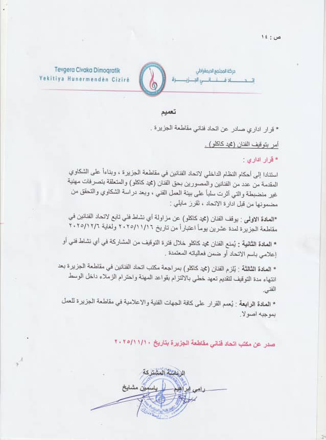 المادة الأولى: يوقف الفنان محمد كاكلو عن مزاولة أي نشاط فني تابع لاتحاد الفنانين في مقاطعة الجزيرة لمدة عشرين يوماً اعتباراً من تاريخ 16/ 11/ 2025، ولغاية 6/ 12/ 2025.