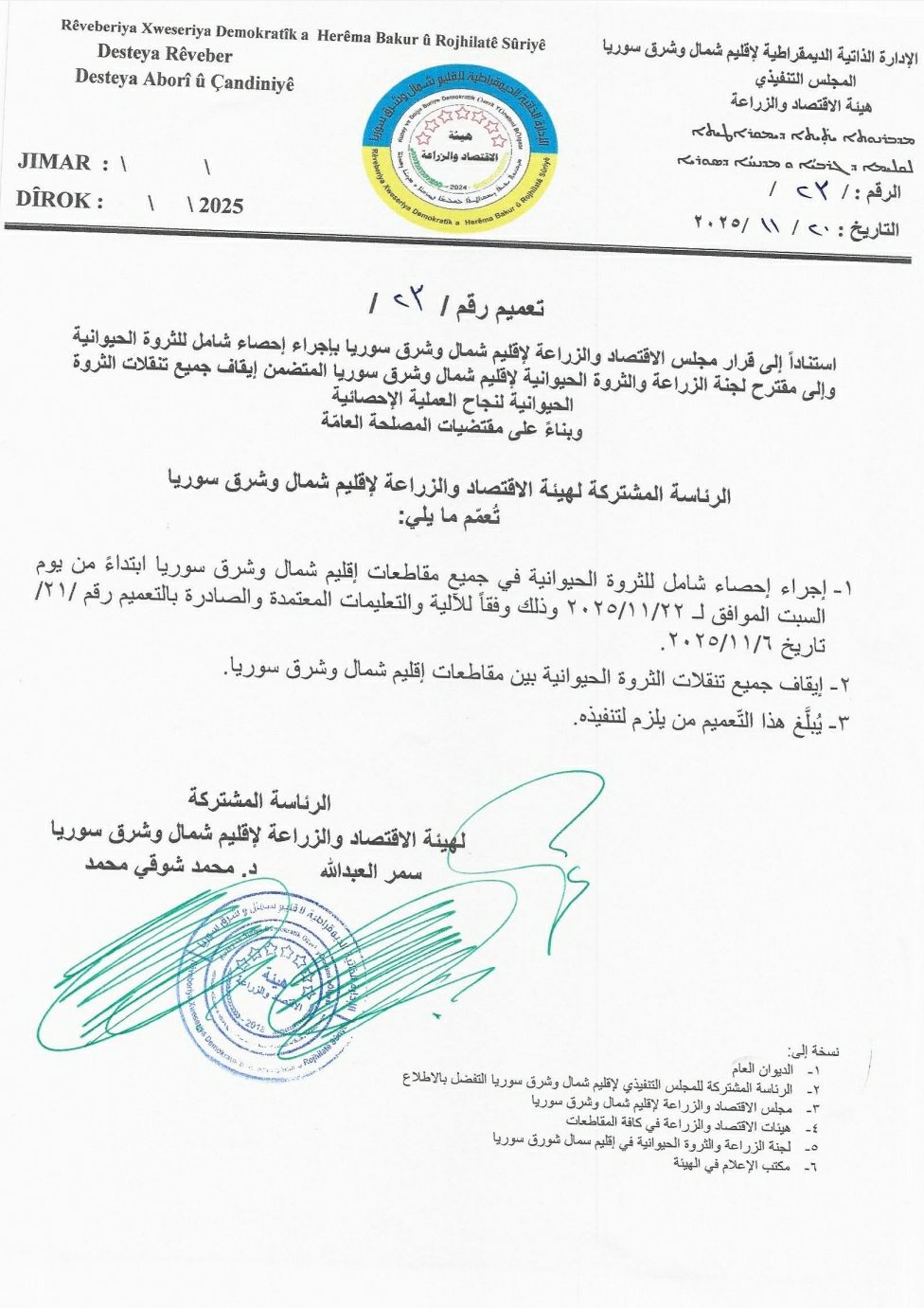 وينص القرار أيضا على إيقاف جميع تنقلات الثروة الحيوانية بين مقاطعات شمال وشرق سوريا طيلة فترة تنفيذ الإحصاء.