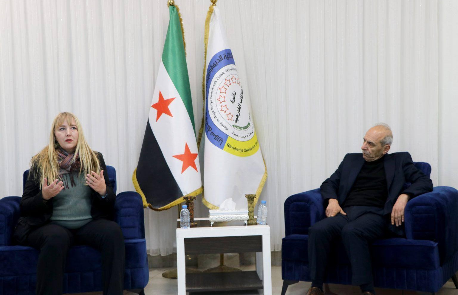 واستقبل الوفد الرئيس المشترك لدائرة العلاقات الخارجية فنر الكعيط، ونائبته كلستان علي، إلى جانب الدكتور عبد الكريم عمر ممثل الإدارة الذاتية في دمشق، والسيد خالد إبراهيم مسؤول القسم الإنساني في الدائرة.