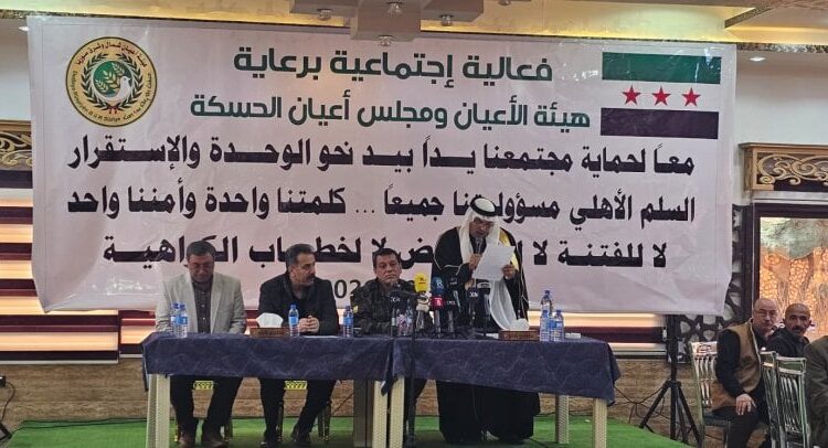 وجاء ذلك خلال الاجتماع نظمته هيئة الأعيان ومجلس أعيان الحسكة تحت شعار “معاً لحماية مجتمعنا ويداً بيد نحو الوحدة والاستقرار. السلم الأهلي مسؤوليتنا جميعاً وكلمتنا واحدة وأمننا واحد. لا للفتنة لا للتحريض لا لخطاب الكراهية”.