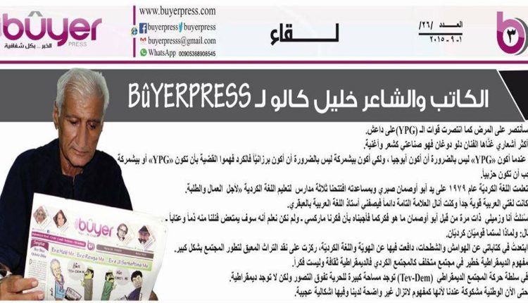 كان دائماً في جاهزية تامة،عيناه كانتا تشعان حياةً وحباً للأرض والتراب، عميقٌ في فكره وتفكره غزير النتاج و الكتابة، يغوص بفكره في قضايا مجتمعه يبحث عن الحل يحلل المسائل ثم ليعود بعد ذلك إلى تركيبها تركيباً منطقياً ينمُّ عن ثقافة عميقة الجذور والمتون، ليّنٌ لطيف في صداقاته، سليل الطبيعة والوجدان الكردي، تميّز عن أقرانه من الكتاب والمثقفين بعلاقاتٍ حميمةٍ مع جميع الساسة والكتاب والمثقفين. لم يعلم الكاتب والشاعر خليل كالو قبل أشهر وهو في رحلته إلى باشور كردستان أنَّ جسده يتعرض لمرض خطير، فصعد جبال قنديل، وشرب من ينابيع السليمانية، وكتب شعراً في هولير، دون أن يشعر بمرضه، كالو الذي سخَّر قلمه منذ بداية ثورة روجآفا للمدافعين عنها فبدأ يكتب يومياً عن ملاحم وأخبار وحدات حماية الشعب والمرأة، فارقه يراعه وفارقته أوراقه ولازمته الأدوية والعقاقير، ذلكم هو كالو ابن الطبيعة عاش وترعرع في قريته “Dêrûna Qulinga” حيث ولد فيها في العام 1958 ودرس في مدارس المنطقة حتى انهى دراسته الجامعية قسم الجيولوجيا التطبيقية من جامعة دمشق.. شاعر مرهف يكتب الشعر الغنائي باللغة الكردية المحكية، مستعيناً بدلالاتِ وصورِ الطبيعةِ، له محبيه وأكثرهم قرباً منه صديقه الحنون الدكتور كسرى حرسان لم يفارقه في مرضه حتى أنه كتب مرثيته قبل أشهر حيث يقول فيها:
