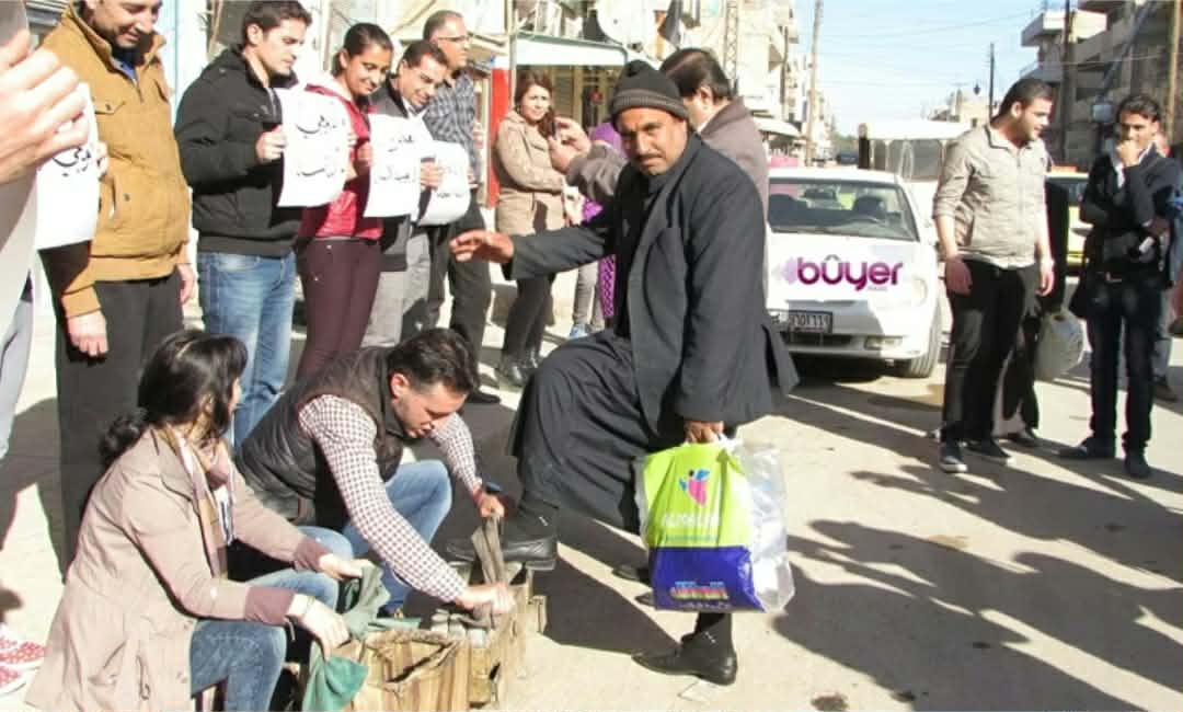 وبدأت الوقفة الساعة الثانية من عصر اليوم الخميس الثامن عشر من شباط/ فبراير على طريق عامودا مقابل جامع قاسمو, حيث افترش منظمو الوقفة الأرض مع صناديق مسح الأحذية, ودعوا المارة لمسح أحذيتهم, وذلك تضامنا مع كل ماسحي الأحذية في العالم, واستنكارا لتصريحات المعارض السوري عبدالرزاق عيد الأخيرة حول اتهامه الشعب الكردي أنهم ماسحو أحذية ونادلو مطاعم في محاولة منه للتقليل من شأن هذا الشعب.