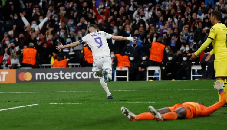 أحرز كريم بنزيمة هدفا بضربة رأس في الوقت الإضافي، ليقود ريال مدريد للتفوق 5-4 على تشيلسي حامل اللقب في مجموع مباراتي دور الثمانية بدوري أبطال أوروبا لكرة القدم والتأهل إلى قبل النهائي، رغم خسارة العملاق الإسباني 3-2 على أرضه يوم الثلاثاء.