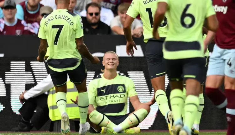 أحرز إرلينغ هالاند هدفين في ظهوره الأول بالدوري الإنجليزي الممتاز لكرة القدم ليفوز مانشستر سيتي حامل اللقب 2-صفر على وست هام يونايتد صاحب الأرض يوم الأحد.